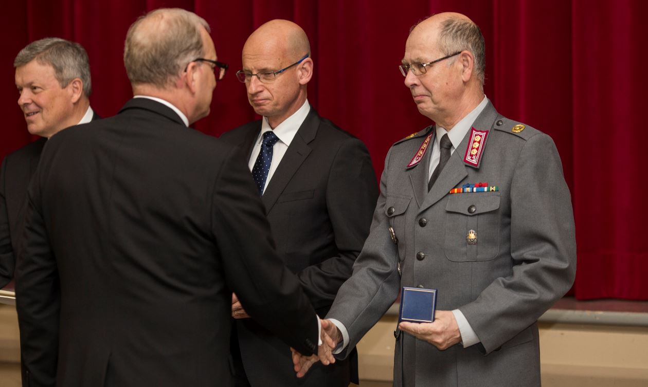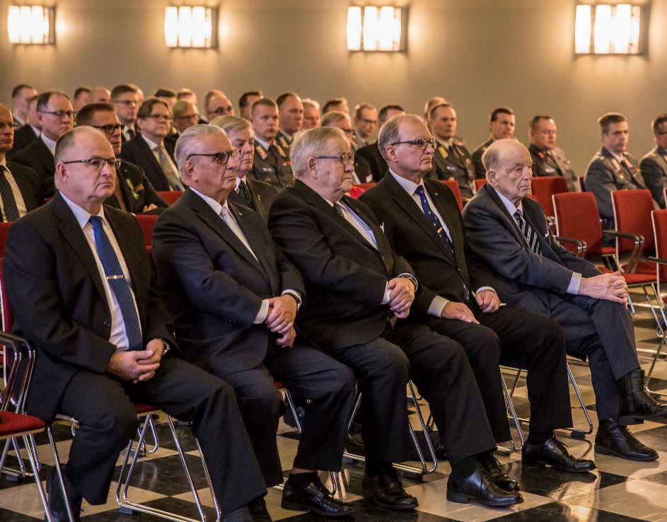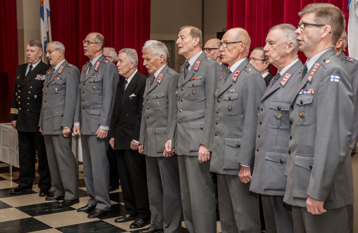 Juhlayleisöä oli runsaasti. Kuvassa (oikealta) säätiön kunniapuheenjohtaja, kenraaliluutnantti Raimo Viita, hallintoneuvoston puheenjohtaja, kenraalimajuri Juha-Pekka Liikola, kunniapuheenjohtaja, kenraaliluutnantti Heikki Koskelo, kunniajäsen, eversti Pertti Vuolento sekä Maanpuolustuskoulutusyhdistyksen toiminnanjohtaja, prikaatikenraali Pertti Laatikainen (Kuva: Aki Aunala/MPKK)