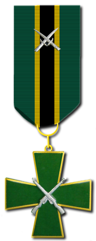 ”Vihreässä kultareunaisessa yrjönristissä ristikkäiset hopeiset kiväärit. Ristiä kannetaan 30 mm leveässä nauhassa, jossa keskellä 10 mm levää keltainen raita, jonka keskellä musta 6 mm leveä raita. Erityisistä ansioista nauhaan voidaan liittää ristikkäiset, hopeiset pistimet.”