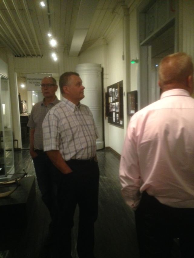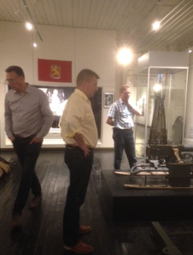 Museonjohtaja Markku Riittinen (oikealla) esitteli hallitukselle museon näyttelyitä. Keskellä hallituksen puheenjohtaja Jari kytölä ja vasemmalla hallituksen jäsen Antti Hannula.